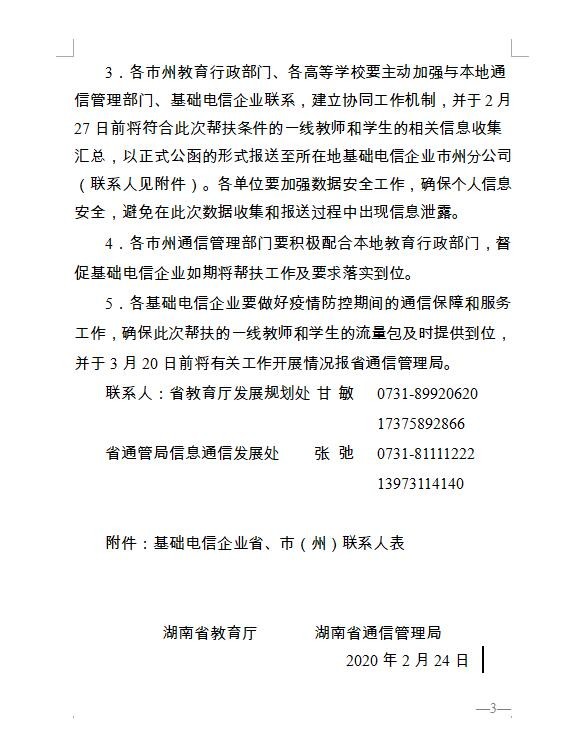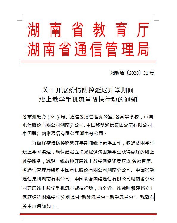 湘教通〔2020〕31号 关于开展疫情防控延迟开学期间线上教学手机流量帮扶行动的通知