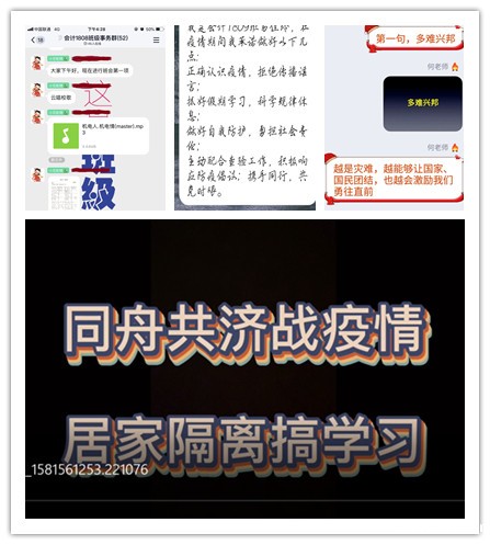 “会计1805班的崽崽们,都进来了吗,现在我们开始点到。”2月13日至2月16日,我院经济贸易学院(二级学院)三个年级共计75个班级陆续召开了“同舟共济战役情,居家隔离搞学习”疫情防控网络思政班会,为了开好此次班会,该二级学院全体辅导员、班主任充分利用网络平台,各显神通,忙的不亦乐乎。