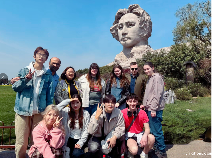 橘子洲头红色之旅。这座横卧湘江的千年沙洲(晋惠帝永兴二年形成),以"中国第一洲"之姿迎接国际访客,文化园内柑橘林,湘江风光、与洲头广场、望江亭等景观相映成趣,将革命精神与生态美学完美融合,生动地诠释了"山水洲城"的独特城市肌理,是理解当代中国的重要窗口,橘子洲头的人文景观以毛泽东青年艺术雕塑为代表,是红色文化的重要象征,师生们于高32米、长83米的毛泽东青年艺术雕塑前,留下了珍贵的合影。