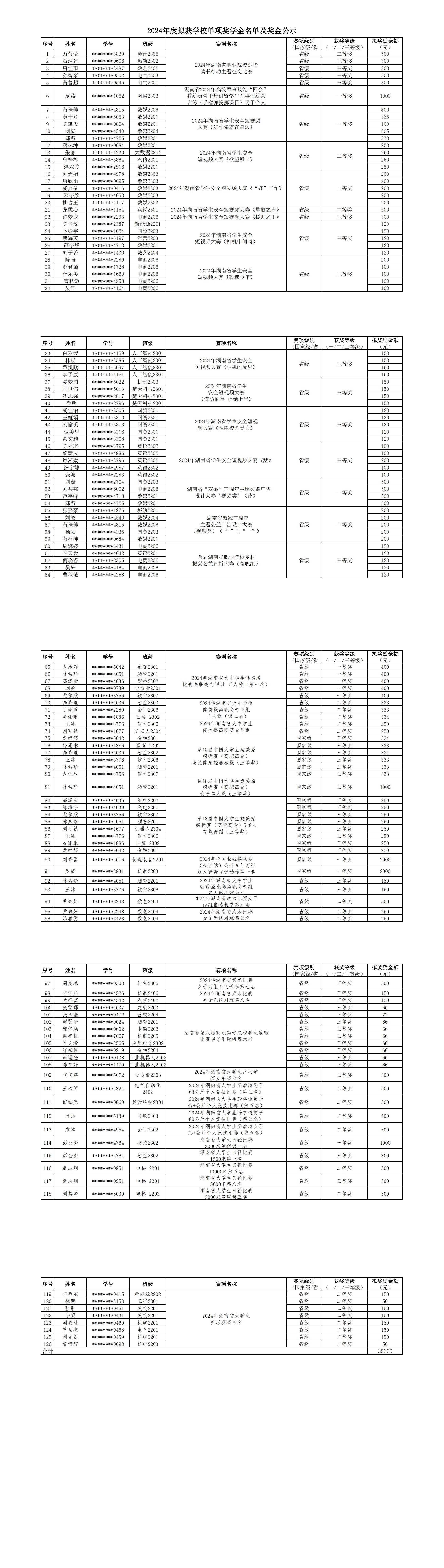 根据《竞技宝app下载官网学生奖学金管理办法》(湘机电职院行字〔2023〕12号)、《竞技宝app下载官网学生资助资金管理实施细则》(湘机电职院行字〔2023〕29号)文件精神,学校组织开展了2024年度单项奖学金认定工作。经归口管理部门根据2024年度学生参加省级及以上教育行政管理部门或行业协会等组织的竞赛获得相关荣誉进行认定、审核、公示,学生工作部(团委)学生资助管理中心复核并报学校学生资助工作领导小组和校长办公会审批,拟认定万莹莹等126人次学生获学校单项奖学金;同时拟为参加体育类竞赛获奖的龙婷婷等46名学生发放集训期间生活补助。现将具体名单、奖励金额及生活补助情况公示如下,公示时间:5月29日-6月5日,公示期5个工作日。如有异议,请于公示期内向学生工作部(团委)学生资助管理中心反映。