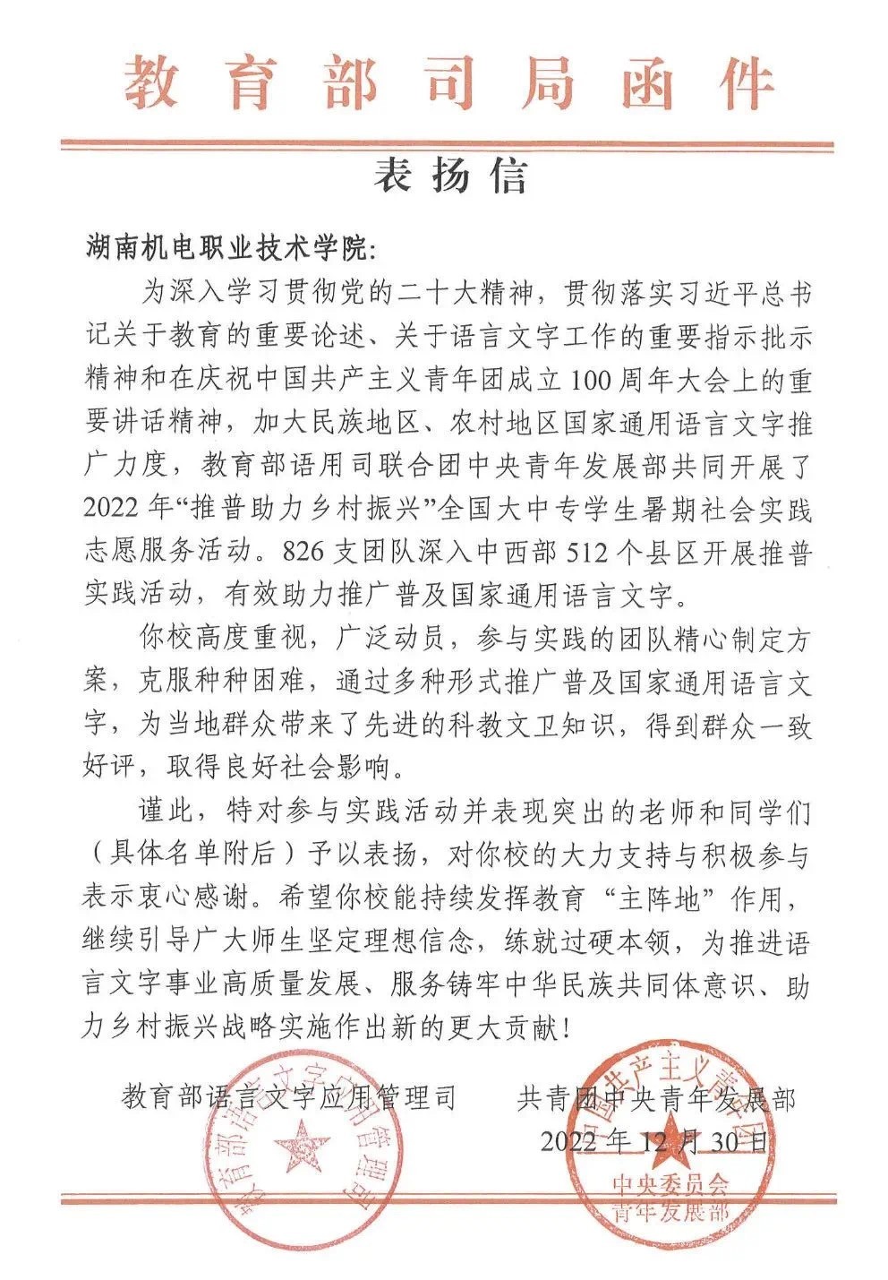 2月23日,我院收到了来自教育部语言文字应用管理司、共青团中央青年发展部寄来的《表扬信》,对湖南机电职院经济贸易学院赴坪溪村推普助力乡村振兴服务队在2022年“推普助力乡村振兴”全国大中专学生暑期社会实践志愿服务活动中的表现给予了高度的评价。