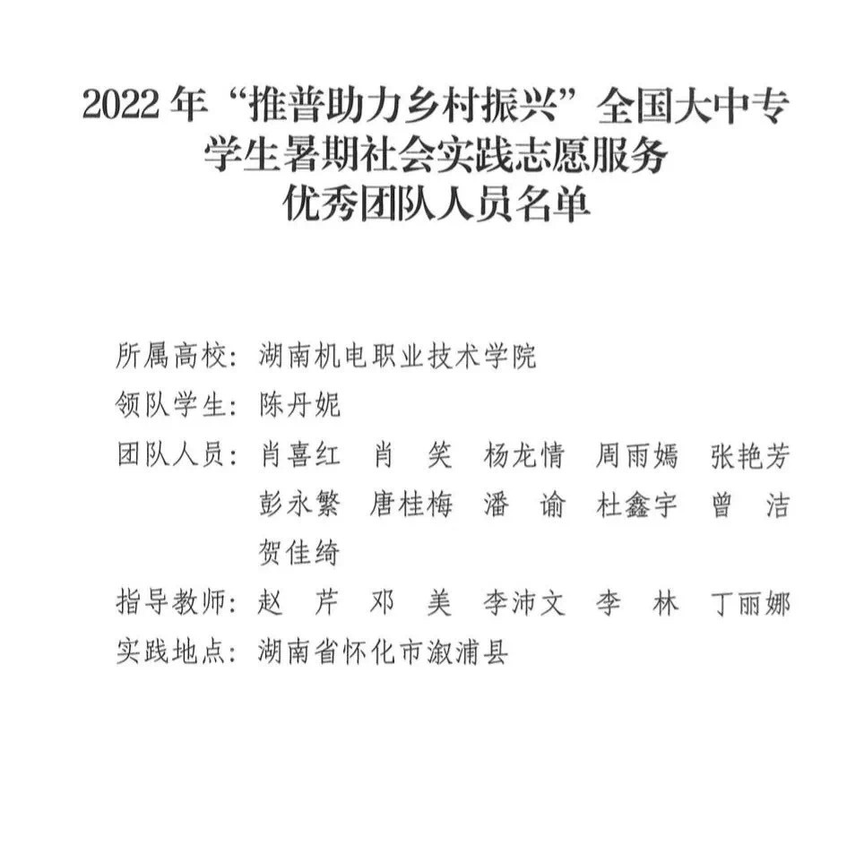 2022年7月,教育部语言文字应用管理司和共青团中央青年发展部联合开展了2022年“推普助力乡村振兴”全国大中专学生暑期社会实践志愿服务,主办方从申报的全国2989支志愿服务团队中,经过层层筛选,共遴选出826支团队参加此专项活动,湖南机电职院经济贸易学院赴坪溪村推普助力乡村振兴服务队成功入选参加该专项活动。